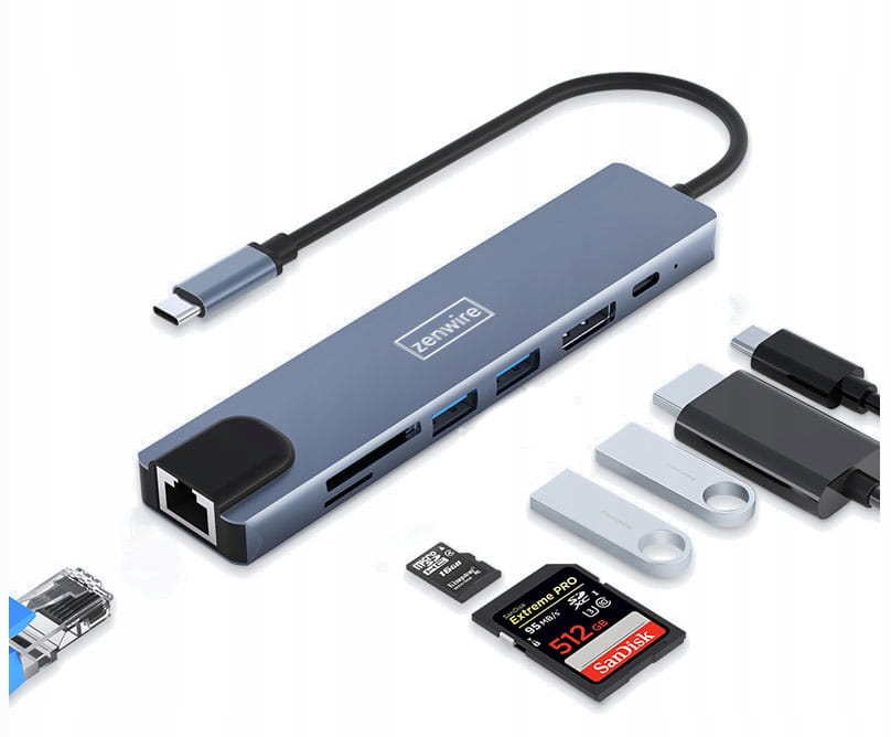 HUB USB-C ADAPTER 8in1 ZENWIRE med portar: Display Port 8K 60HZ / 4K 144 Hz, 2x USB, SD och micro SD, FAST Ethernet, Power Delivery 3.0 100W