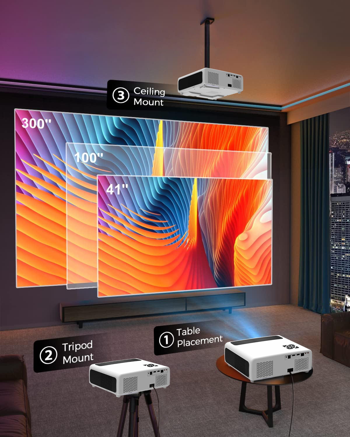 ✅ Bekväm användning och obegränsad justerbarhet - Autofokus - autofokus på några sekunder, automatisk korrigering vertikalt och horisontellt (Autokeystone 4D), ZOOM-funktion möjlighet att minska bilden för att passa väggen, Projektorn kan projicera en rak bild även om den står i sidled mot väggen(sidoprojektion), 360-funktion - 360-graders rotationsmöjlighet, bakprojektion.