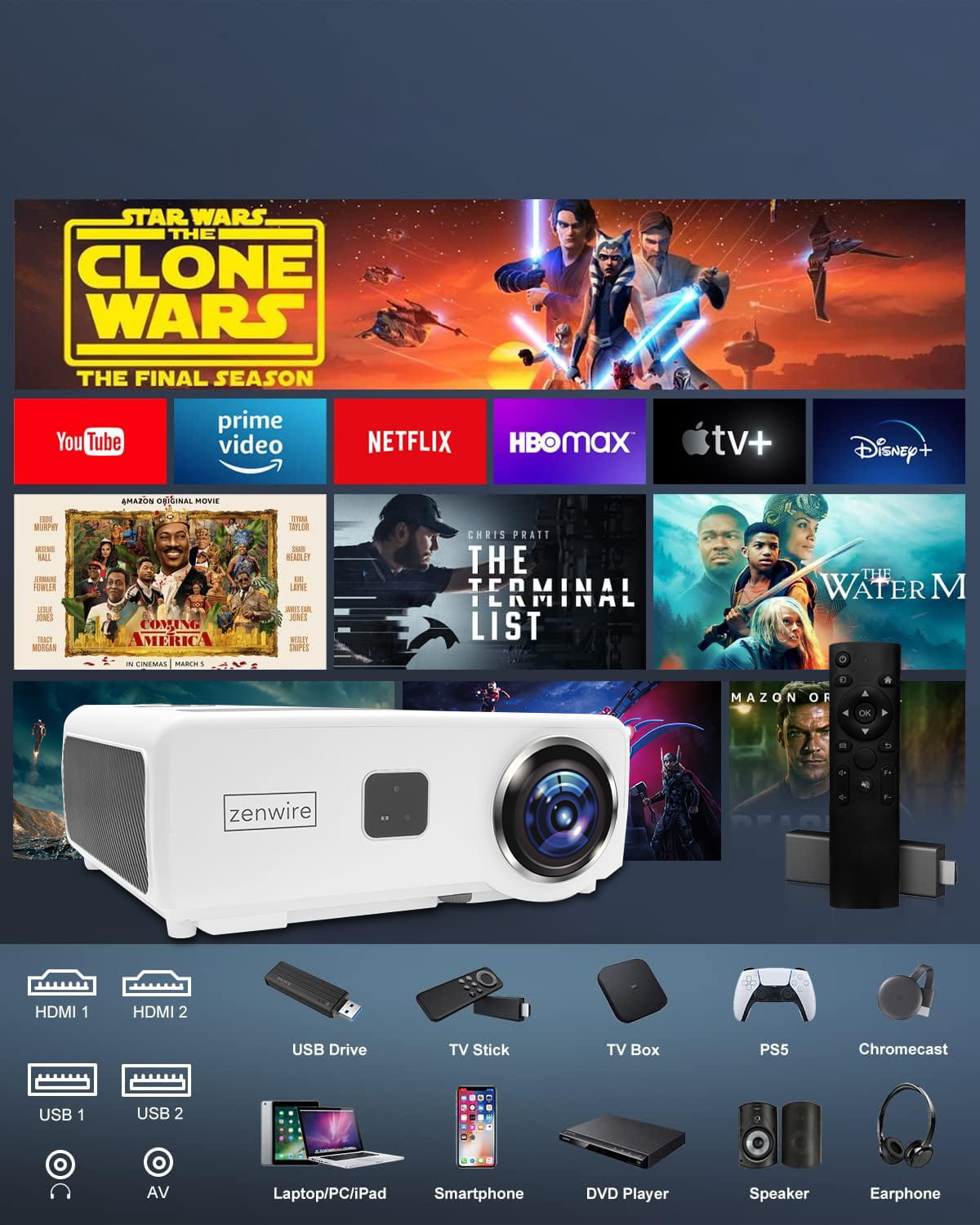 ✅ Zenwire e660h-projektor med ANDROID SMART TV med tillgång till populära appar som Netflix, Youtube, Prime Video, HBO GO, Spotify, Disney+ och mer! Spela dina favoritfilmer direkt på projektorn utan behov av ytterligare enheter!