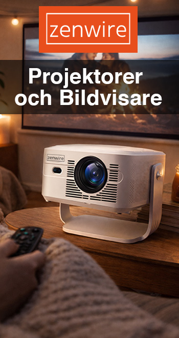 Projektorn har en 360-displayfunktion, så att du kan justera bildens vinkel och rotera den 90 grader i endera riktningen efter behag. På så sätt kan du till exempel montera projektorn upp och ned i taket och projicera bilden när det passar dig genom att rotera bilden till exempel 180 grader.